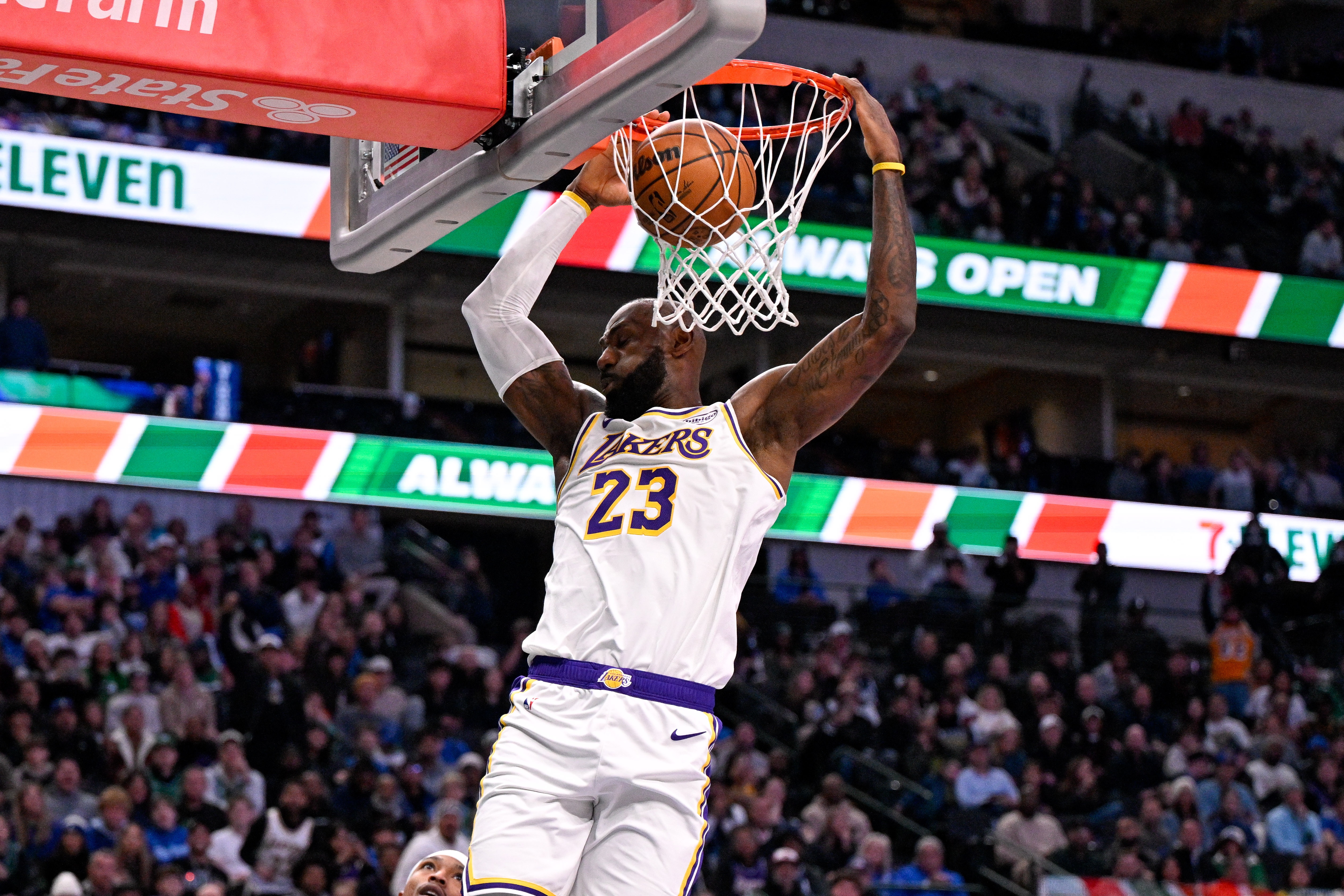 詹姆斯进入NBA至今27次砍下45+,其中最高分是2014年3月对阵山猫时爆砍61分,此外还有7篮板进账。